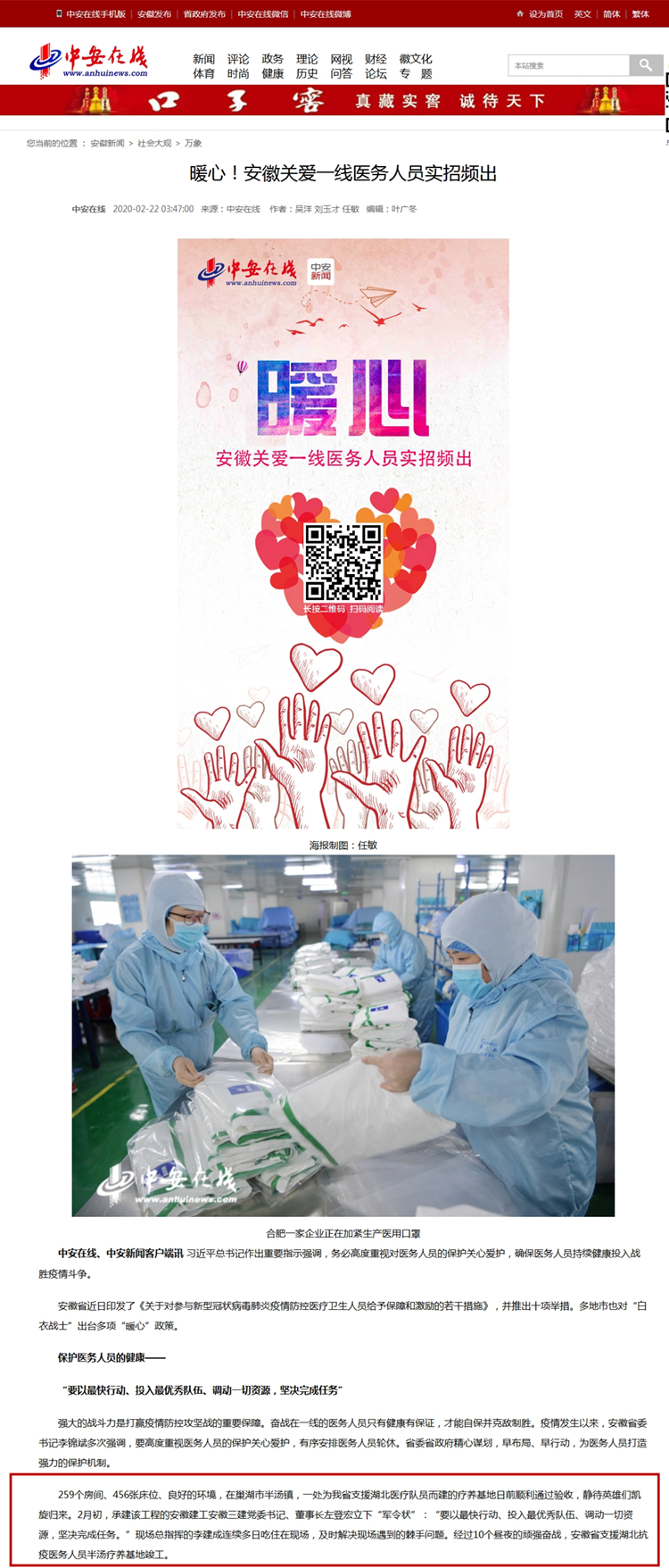中安在線、央廣網、中新網、國際在線——暖心!安徽關愛一線醫務人員實招頻出 發布時間:2020-02-26 來源:中安在線、央廣網、中新網、國際在線 撰稿人: 瀏覽次數:15916 網址鏈接: 中安在線:http://ah.anhuinews.com/system/2020/02/22/008352394.shtml 央廣網:http://news.cnr.cn/native/gd/20200222/t20200222_524987284.shtml 中新網:http://www.chinanews.com/sh/2020/02-22/9101239.shtml 國際在線: http://news.cri.cn/20200222/6faa4074-5d1b-ef06-5944-b8a7ca8d5931.html