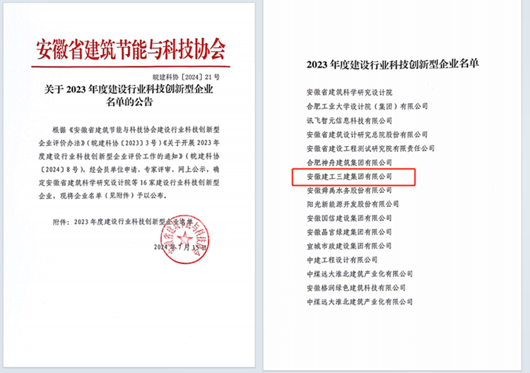 近日,安徽省建筑節能與科技協會公布“2023年度建設行業科技創新型企業”名單,安徽建工三建集團作為唯一一家省屬國有施工企業榮登榜單。